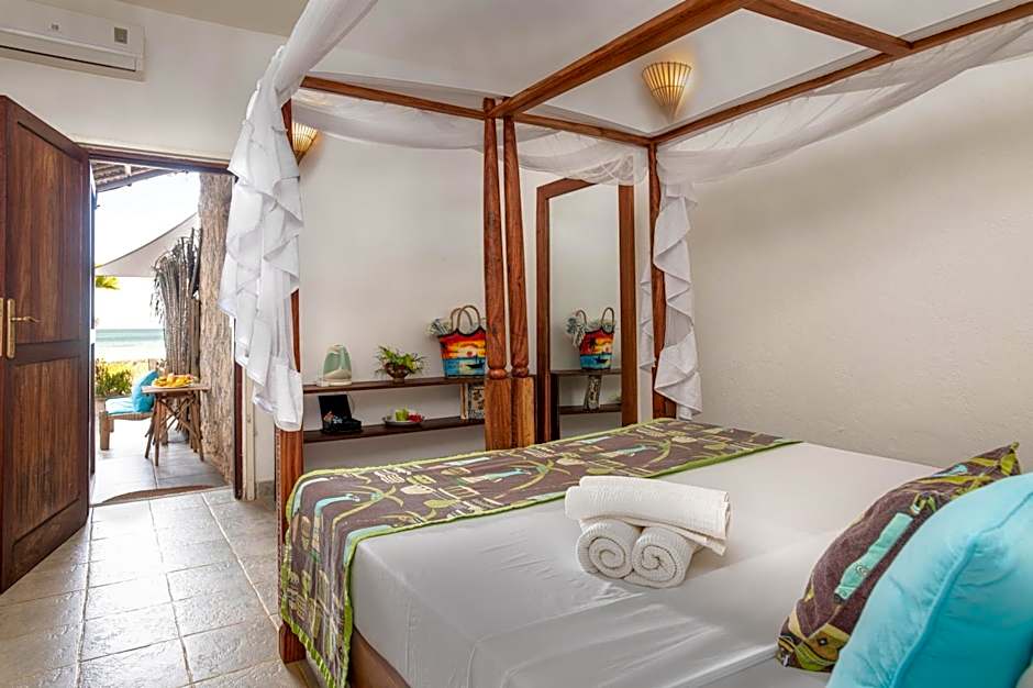 This ground floor sea view room has a furnished outdoor terrace with direct access to the beach and can accommodate up to 2 people. It is decorated in a bright, modern Swahili style with sea view and has an private bathroom with a shower and bidet.